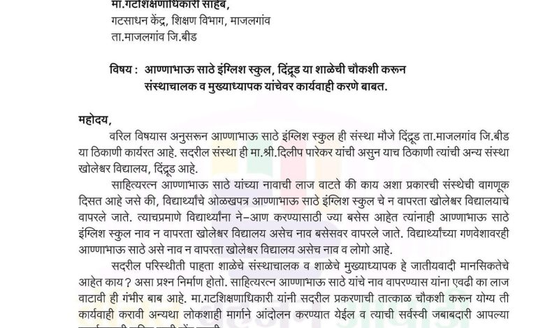 माजलगाव, ८ जुलै (प्रतिनिधी) :माजलगाव तालुक्यातील दिंद्रूड येथील सा. अण्णाभाऊ साठे इंग्लिश स्कूल पुन्हा एकदा वादाच्या केंद्रस्थानी आली आहे. शाळेचे संस्थापक दिलीप पारेकर यांच्यावर अनेक पालकांची फसवणूक केल्याचा आरोप होत असून, शाळेच्या नावात घोळ करून खोलेश्वर विद्यालय या त्यांच्याच दुसऱ्या संस्थेच्या नावाचा सर्रास वापर केला जात असल्याचे पुन्हा एकदा समोर आले आहे. या गंभीर प्रकारामुळे साहित्यरत्न अण्णाभाऊ साठे यांच्या नावाची बदनामी होत असून, संस्थाचालकांवर जातीयवादी मानसिकतेचा संशय व्यक्त केला जात आहे. वंचित बहुजन आघाडीने या प्रकरणी थेट गटशिक्षणाधिकारी यांच्याकडे तक्रार करत कारवाईची मागणी केली आहे.