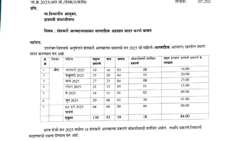 वरील आकडेवारीनुसार, १ जानेवारी २०२५ ते ४ जुलै २०२५ या १८५ दिवसांत एकूण १३० शेतकरी आत्महत्यांची नोंद झाली आहे. यापैकी ९३ प्रकरणे मदतीसाठी पात्र ठरली आहेत, तर २० प्रकरणे अपात्र ठरवण्यात आली आहेत. विशेष म्हणजे, १८ प्रकरणे आजही चौकशीसाठी प्रलंबित आहेत. या कालावधीत ८४ लाख रुपयांची मदत वितरित करण्यात आली असून, सन २०२५ मधील १८ शेतकरी आत्महत्या प्रकरणे चौकशीसाठी प्रलंबित असुन प्रलंबित प्रकरणे निकाली काढण्याची दक्षता घेतली जात असल्याचेही तहसीलदार (महसूल-१), जिल्हाधिकारी कार्यालय बीड यांनी विभागीय आयुक्तांना सादर केलेल्या अहवालात नमूद केले आहे.