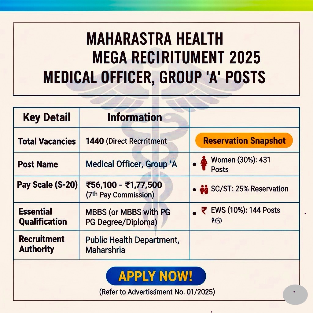 मुंबई, ०५ नोव्हेंबर, २०२५ (विशेष प्रतिनिधी): महाराष्ट्र राज्याच्या सार्वजनिक आरोग्य विभागाने वैद्यकीय अधिकारी (Medical Officer) गट-अ (Group-A) संवर्गातील तब्बल १४४० रिक्त पदांसाठी सरळसेवा भरतीची जाहिरात (जाहिरात क्र. ०१/२०२५) प्रसिद्ध केली आहे. आरोग्य विभागातील ही सर्वात मोठी पदभरती असून, वैद्यकीय शिक्षण पूर्ण केलेल्या उमेदवारांसाठी शासकीय सेवेत रुजू होण्याची ही सुवर्णसंधी आहे. राज्यातील प्राथमिक आरोग्य केंद्रे (PHC), ग्रामीण रुग्णालये आणि जिल्हा रुग्णालयांमध्ये मनुष्यबळ वाढवून आरोग्य सेवा अधिक बळकट करण्याच्या उद्देशाने हा महत्त्वपूर्ण निर्णय घेण्यात आला आहे. वैद्यकीय अधिकारी गट-अ या पदासाठी उमेदवारांची निवड झाल्यावर त्यांना सातव्या वेतन आयोगानुसार (7th Pay Commission) आकर्षक वेतनश्रेणी मिळणार आहे.