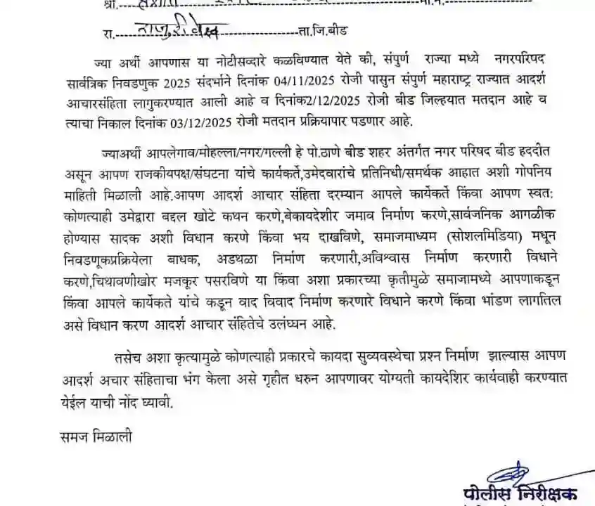 बीड, १९ नोव्हेंबर (विशेष प्रतिनिधी): बीड शहरातील आंबेडकरी चळवळीतील अग्रणी नेतृत्व पप्पूजी कागदे यांना पोलिस प्रशासनाने नुकतीच एक नोटीस बजावली आहे. मात्र, ही नोटीस पूर्णपणे नियमबाह्य, कायदेशीरदृष्ट्या सदोष आणि पोलिसांच्या अधिकारक्षेत्राबाहेरील असल्याची तिखट प्रतिक्रिया ज्येष्ठ सामाजिक कार्यकर्ते आणि कायदे अभ्यासक डॉ. गणेश ढवळे (लिंबागणेशकर) यांनी दिली आहे. सदर कारवाईमागे राजकीय दबाव असल्याचा स्पष्ट संशय व्यक्त करत, त्यांनी प्रशासनाच्या या भूमिकेवर गंभीर आक्षेप नोंदवले आहेत.